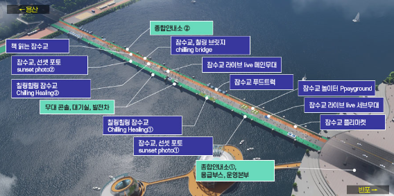 1)잠수교, 칠링 브릿지 chilling bridge: 잠수교의 아이덴티티를 담은 공간으로, 걷고 싶은 잠수교 산책길을 조성했습니다. 잠수교 21-24 경간에 위치하며, 넓고 시원한, 바다와 같은 한강을 느낄 수 있는 공간 디자인 연출을 진행합니다.