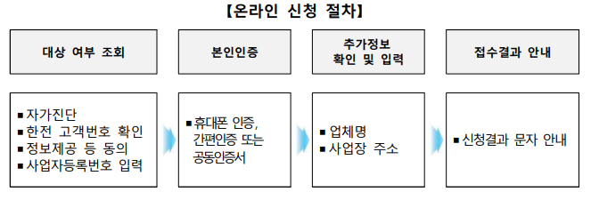 ※ 온라인 신청을 원칙으로 하며 포털사이트에서 “소상공인 전기요금 특별지원” 검색 또는 주소창에 “소상공인전기요금특별지원.kr” 입력하면 접속 가능합니다.