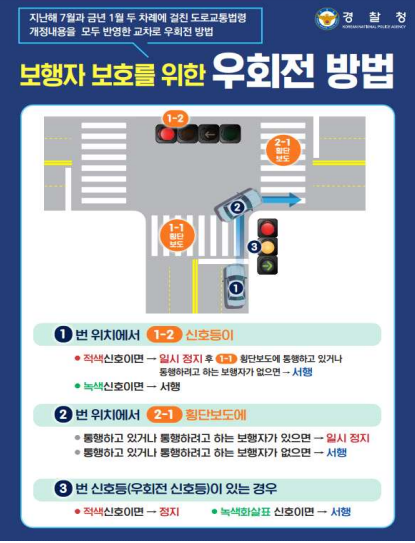 위 내용은 정부에서 배포한 자료이지만, 한 눈에 들어오지 않아서 다시 정리해 보았습니다. 운전자들 사이에서는 실제 운전을 하다 보면 멈춰야 하는지, 그냥 지나가도 되는지 헷갈릴 때가 많아 '우회전 신호등'이 생겼으면 좋겠다는 말이 나오고 있습니다. 전국에 15개소에 설치되어 있다고 하니 턱 없이 부족한 수입니다. 다만, 도산공원 사거리 일대에는 조만간 우회전 신호등이 시범 설치될 예정이라고 합니다. 일각에서는 신호등을 추가로 설치한다는 것은 규제의 수준을 더 높인다는 의미이기 때문에 이왕이면 우회전 신호등 없이 적응하는 게 낫다는 의견이 있지만, 개인적으로는 억울한 상황을 피하기 위해서는 오히려 우회전 신호등이 설치되는 것이 낫다는 생각입니다.